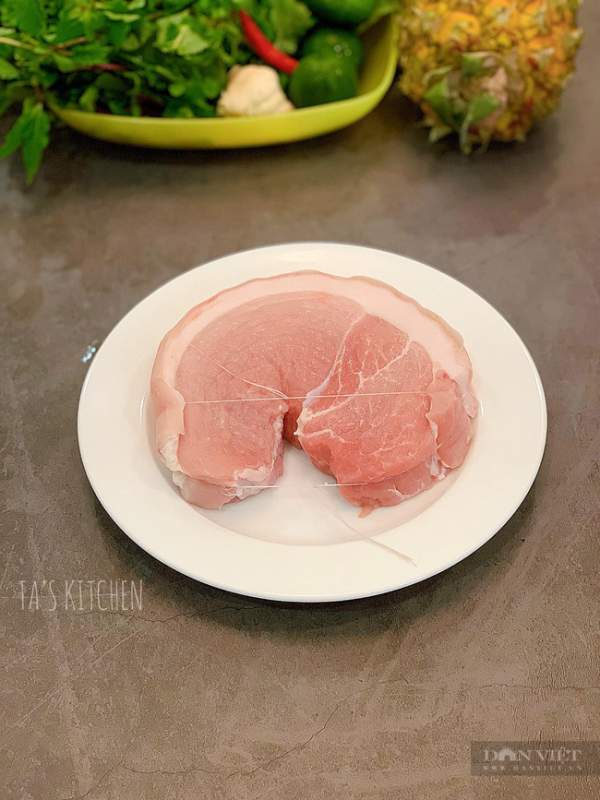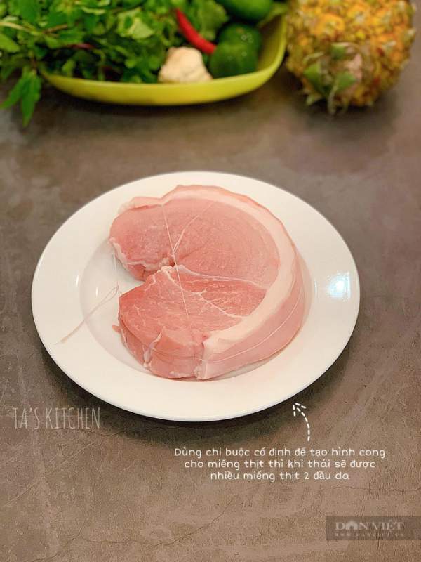 - Thịt heo rửa sạch, dùng chỉ buộc cố định để tạo độ cong cho miếng thịt thì khi thái sẽ được nhiều miếng thịt 2 đầu da.
