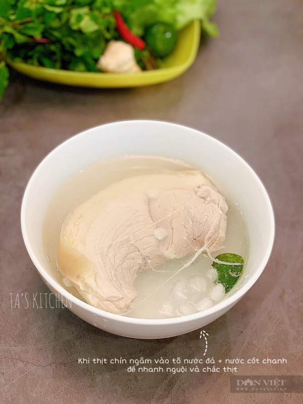 - Thịt chín lấy ra ngâm vào tô nước đá và nước cốt chanh để nhanh nguội và chắc thịt.