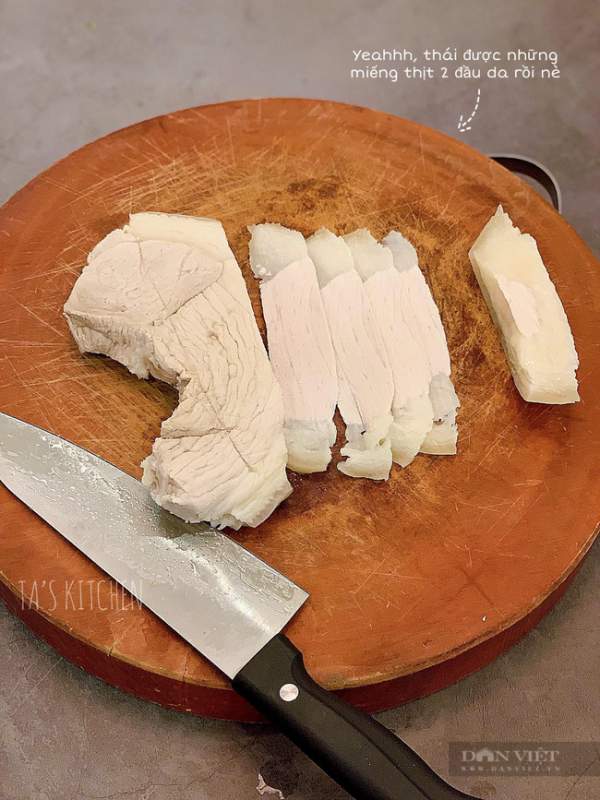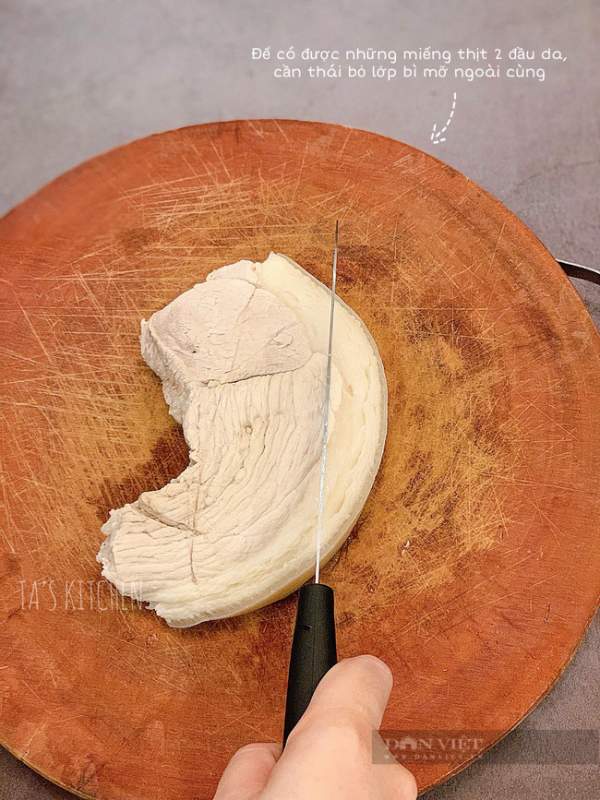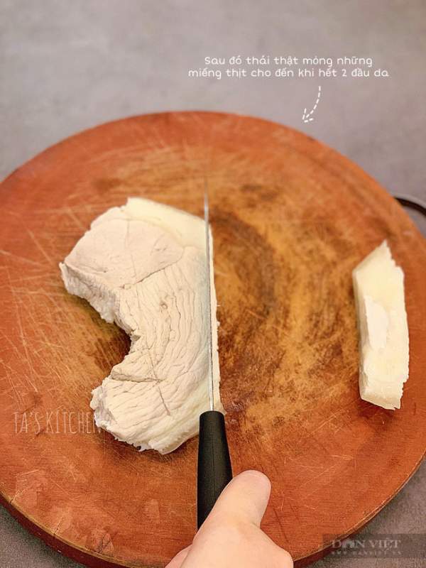 - Khi thịt đã nguội tiến hành thái thịt. Để có được những miếng thịt 2 đầu da, cần thái bỏ lớp bì mỡ ngoài cùng, sau đó thái thật mỏng những miếng thịt cho đến khi hết 2 đầu da.