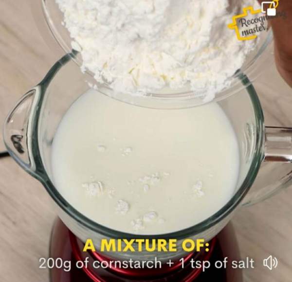 Tiếp đó, đổ 200 gram bột bắp và 1 thìa cù dìa muối