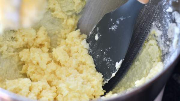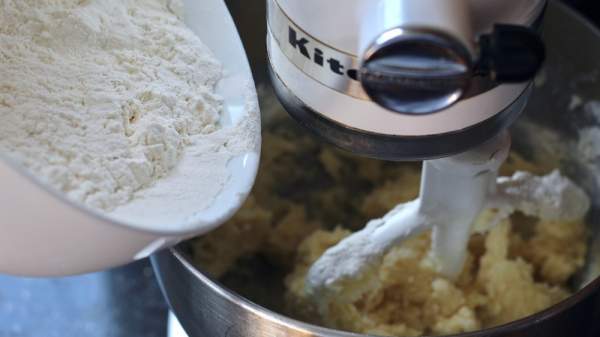 Bước 5: Thêm vào hỗn hợp một ít bột và trộn ở tốc độ thấp cho đến khi hỗn hợp được ẩm đều. Nếu bột quá khô và vụn, hãy thêm vào một thìa sữa để hỗn hợp mềm ẩm hơn. Để hỗn hợp vào trong tủ lạnh 15 phút.