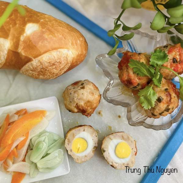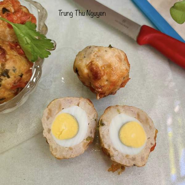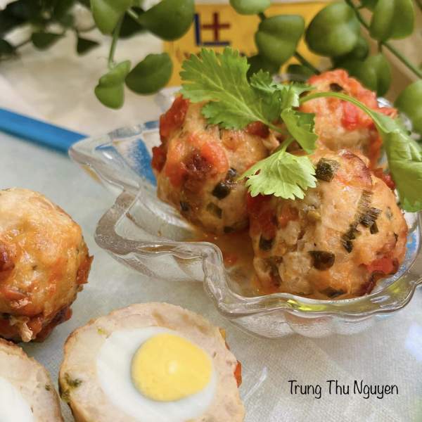 Bước 4: Lấy thịt vo viên, ấn dẹp và cho trứng cút vào làm nhân rồi vo tròn lại là được.