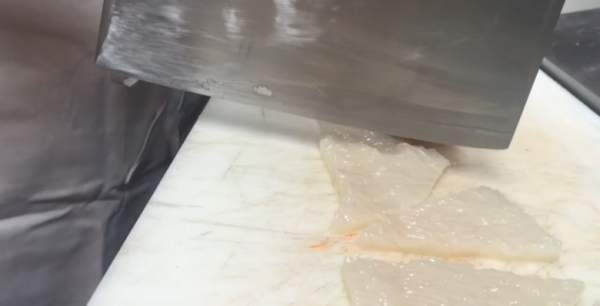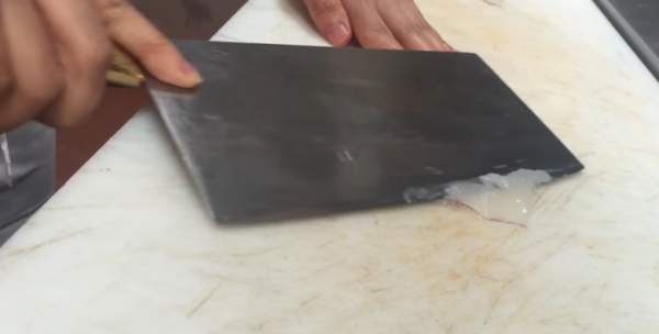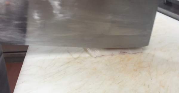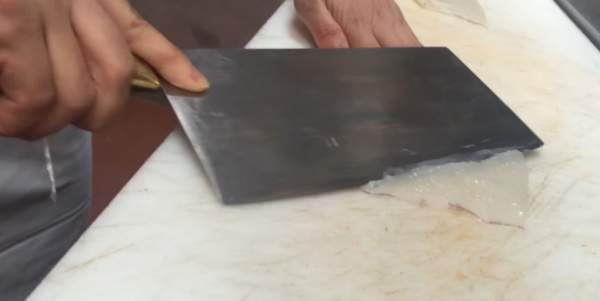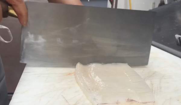 Sau đó, vẫn ở mặt mực này, dao để nghiêng 1 góc 30 độ, khứa lưỡi dao vào ở góc của miếng mực, tạo thành một đường cắt hơi sâu một chút nhưng không được làm đứt mực. Sau đó cắt các đường tương tự như trên song song với đường ban đầu, mỗi đường như vậy cách nhau 1 khoảng từ 1-1,25cm. Khứa lần lượt cho đến hết. (Lưu ý: Nếu không thích khứa chéo bạn hoàn toàn có thể khứa các đường vuông góc với các đường ban đầu đều được).