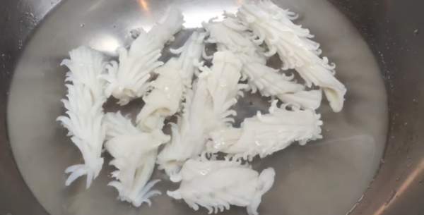 Đun sôi nồi nước, thả mực đã tỉa hoa xong, cho vào chần khoảng mấy giây là mực co lại, sau đó các đường đã tỉa sẽ xòe ra như bông hoa rất đẹp. Vớt mực ra thả vào chậu nước lạnh cho săn chắc.