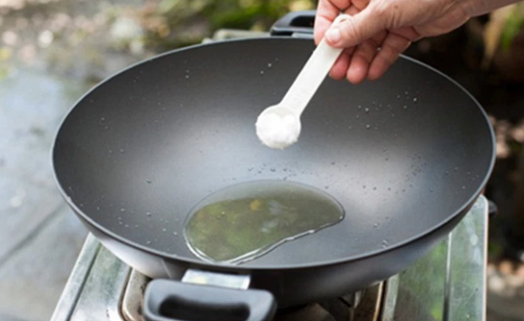Bắc chảo lên bếp, đổ một lượng dầu ăn phù hợp. Cho thêm vài hạt muối (muối biển, muối hạt) vào chảo đun nóng như bình thường. Khi dầu nóng thì bỏ cá vào rán như mọi khi.