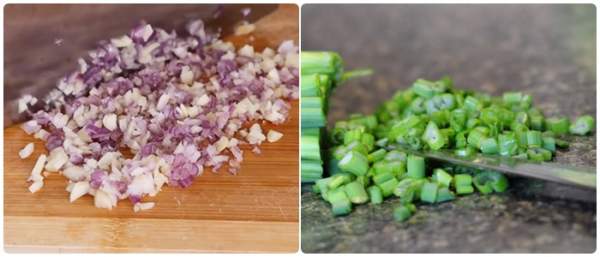 Hành khô bóc vỏ, thái lát. Hành lá rửa sạch, thái nhỏ.