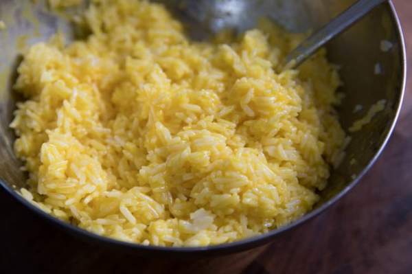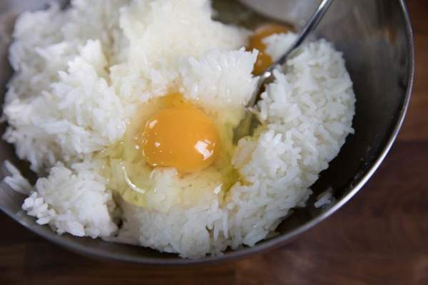 Để cơm rang và trứng quyện đều vào nhau, lên màu vàng đẹp, hãy đập trứng vào thẳng bát cơm nguội, rồi trộn đều lên sao cho trứng bám đều vào từng hạt cơm là được.
