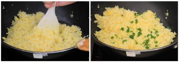Cho dầu ăn vào chảo, đun nóng sau đó cho hành khô đã thái nhỏ vào phi thơm. Khi hành thơm, đổ cơm nguội đã trộn trứng vào, dùng muôi gỗ rang đều tay. Lưu ý, để lửa vừa.