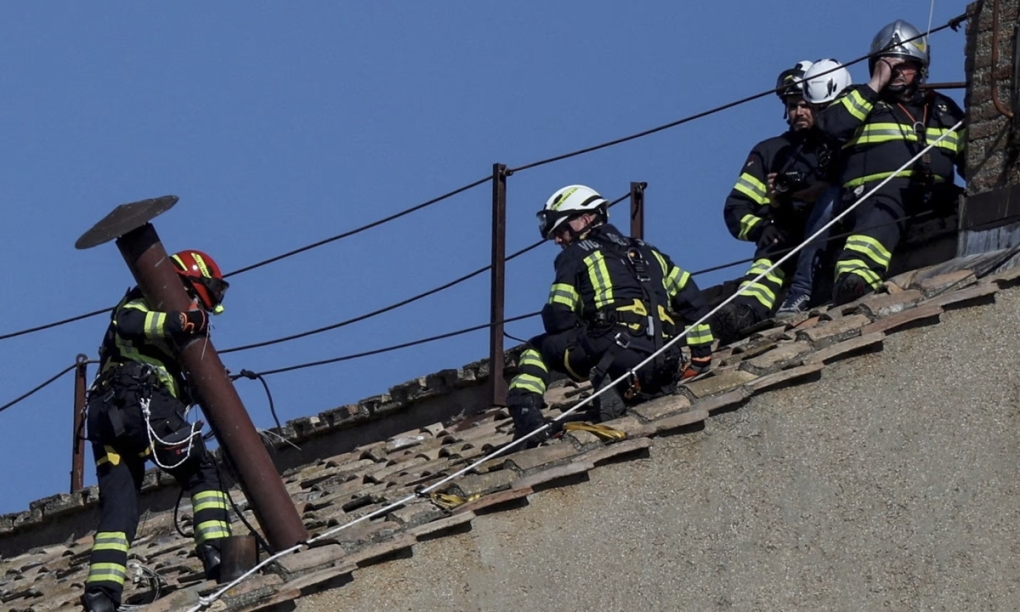 Nhân viên cứu hỏa lắp ống khói trên Nhà nguyện Sistine ở Vatican ngày 2/5. Ảnh: Reuters