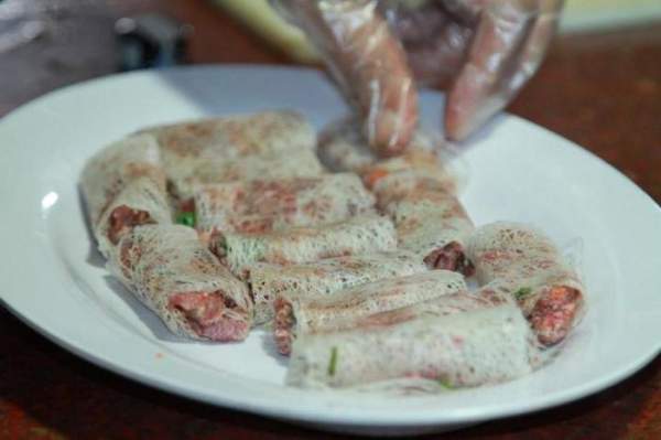 Quan trọng nhất phải kể đến bước làm sạch đẻn biển. Trước tiên phải cắt tiết, sau đó cạo sạch vảy bằng nước sôi, mổ bụng, bỏ phần ruột và phần đầu. Tiếp đến, đầu bếp sẽ đem băm đẻn biển thật nhuyễn, vừa băm vừa nêm gia vị cho hợp với khẩu vị.
