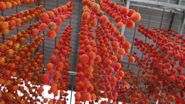 Chị Lan Anh (con gái bà Đặng Thị Thu Vân cho biết: "Để làm hồng treo gió, những trái hồng vừa già tới, tích đủ lượng đường bên trong sẽ được thu hoạch đưa về xưởng chế biến. Vì vậy, khi treo được khoảng 20 ngày thì trái hồng sẽ thoát hết nước, còn lại phần mật và đường bên trong, tạo nên độ ngọt thanh cho trái hồng treo". Ảnh: Văn Long.
