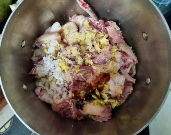Bước 2: Thịt vịt chặt miếng cho vào bát + 1/2 thìa cà phê hạt nêm + 1/2 hành khô, tỏi băm nhỏ + 1/2 thìa cà phê hạt tiêu + 1/2 thìa cà phê đường + 2 thìa xì dầu rồi xóc đều tất cả các nguyên liệu lại với nhau và ướp chừng 20 phút để thịt ngấm gia vị. Như vậy cách làm vịt kho rau răm thơm ngon, đậm vị hơn.