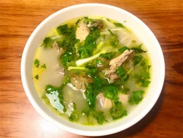 Thả sâu vào nồi nấu khoảng 3-5 phút cho mềm thì vớt ra và dầm nát rồi cho vào nồi. Nêm nếm gia vị lần nữa cho vừa miệng. Cho lá é và hành lá vào nồi rồi đảo đều là có thể tắt bếp. Múc ra bát, rắc tiêu lên trên và thưởng thức.
