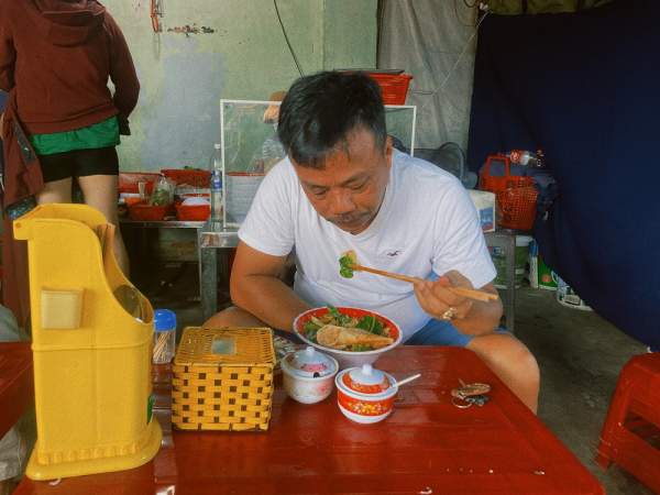 Chị vừa bán vừa nhanh miệng dặn người anh trai đang ngồi bên cạnh phụ làm, giọng chị Huyền lanh lảnh mà nhẹ nhàng thân thương: “tô của chị nớ đừng bỏ ớt cay nghe”, “tô bên bàn bên tê không ăn rau sống mô”… Giọng Huế ngọt lịm khiến thực khách chưa ăn mà đã say lòng.
