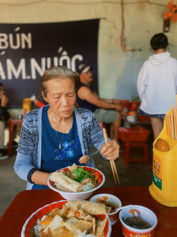 Mệ Mai (68 tuổi) là chủ hàng điện tử ở đường Phan Đăng Lưu (TP Huế). Được biết, mệ là một khách hàng quen thuộc của quán bún giấm nuốc. Cứ chiều chiều khi nắng hè đã dịu bớt đi, mệ Mai thường đạp xe từ cửa hàng qua quán bún để thưởng thức hương vị quen thuộc, thói quen đó đã được duy trì được mười mấy năm.