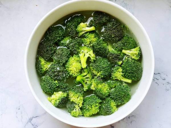 Đem súp lơ rửa với nước sạch, sau đó ngâm qua nước muối nhạt có pha thêm một ít baking soda để loại bỏ những bụi bẩn, sâu bọ, trứng côn trùng có bên trong kẽ súp lơ một cách hiệu quả.