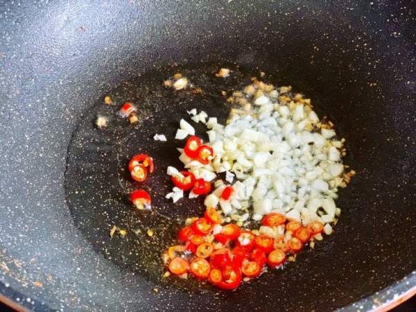 Cho một ít dầu vào chảo, sau khi đun nóng, cho tỏi và ớt vào phi thơm.