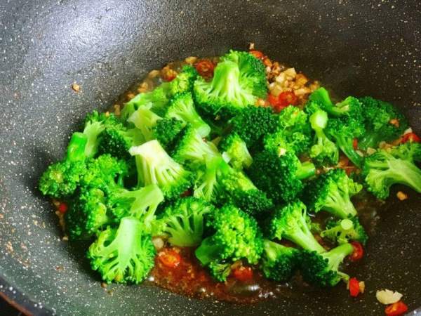 Tiếp theo, cho súp lơ đã ráo nước vào xào nhanh tay, đổ nước sốt đã chuẩn bị trước vào, đảo đến khi nó sệt lại, súp lơ chín thì tắt bếp.