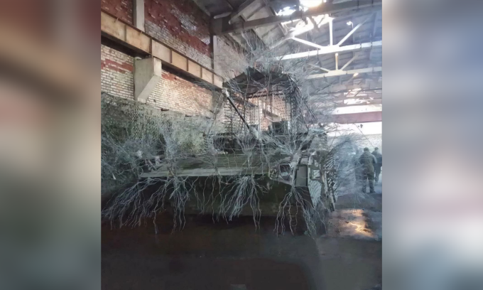 Hình ảnh đăng trên mạng xã hội hôm 26/5 cho thấy một xe chiến đấu bộ binh dòng BMP của quân đội Nga được bọc giáp lồng xung quanh tháp pháo, cùng nhiều búi sợi kim loại chĩa ra bên ngoài.