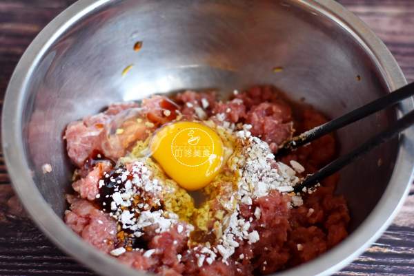 Trộn thịt xay với trứng gà, bột bắp, nước tương, dầu hào, dầu ăn, muối.