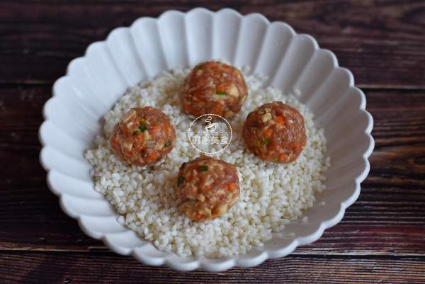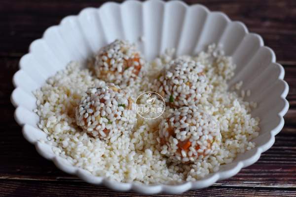 Vo viên nhân thịt rồi lăn vài vòng qua nếp.