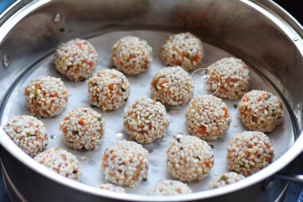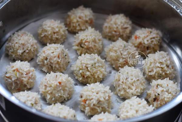 Xếp các viên nếp bọc thịt này vào xửng, không nên xếp quá gần vì nếp còn nở ra. Chú ý phết một lớp dầu dưới đáy hoặc lót giấy thấm dầu để chống dính.