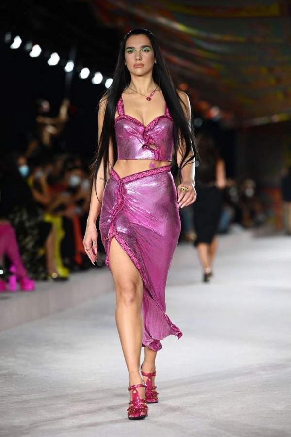 Ngày 24/9, Dua Lipa gây chú ý khi đảm nhận vai trò vedette trong show của Versace. Nữ ca sĩ, biểu tượng thời trang mới nổi khoe dáng trong những bộ đồ cắt xẻ táo báo, áo nịt ngực ôm sát cơ thể. Cô được mệnh danh là IT Girl thời đại mới khi liên tục dẫn đầu xu hướng, xuất hiện trong những bộ đồ Y2K gợi cảm.