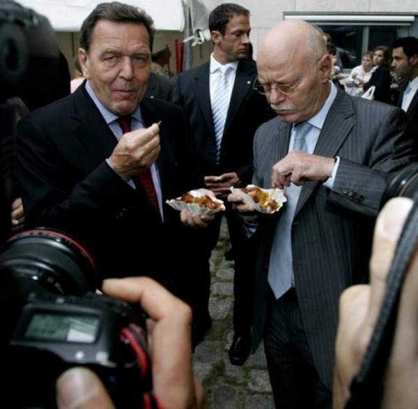 Cựu thủ tướng Gerhard Schroeder (trái) cũng được biết đến là một "người hâm mộ lớn" của món ăn này. Một sự thật thú vị về món ăn này nữa là theo truyền thống, mọi ứng viên cho chức thị trưởng Berlin đều được chụp ảnh tại một quầy bán currywurst. Ảnh: Welt